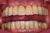 Patiente venue au cabinet pour une demande esthétique et fonctionnelle. Ses deux souhaits : pouvoir remanger tout type d’aliment et sourire avec sa famille et ses amis. En une seule séance chirurgicale, nous avons pu lui permettre de retrouver le sourire avec un bridge provisoire complet immédiat sur implants avant de passer 6 mois après au bridge d’usage céramique (vue clinique finale).