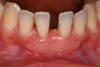 Patiente présentant deux récessions gingivales sur ces incisives inférieures avec une absence de gencive et des tractions muqueuses. Le choix a été fait après discussion avec la patiente d’une greffe gingivale de surface, fin d’intervention et résultat à 1 mois.